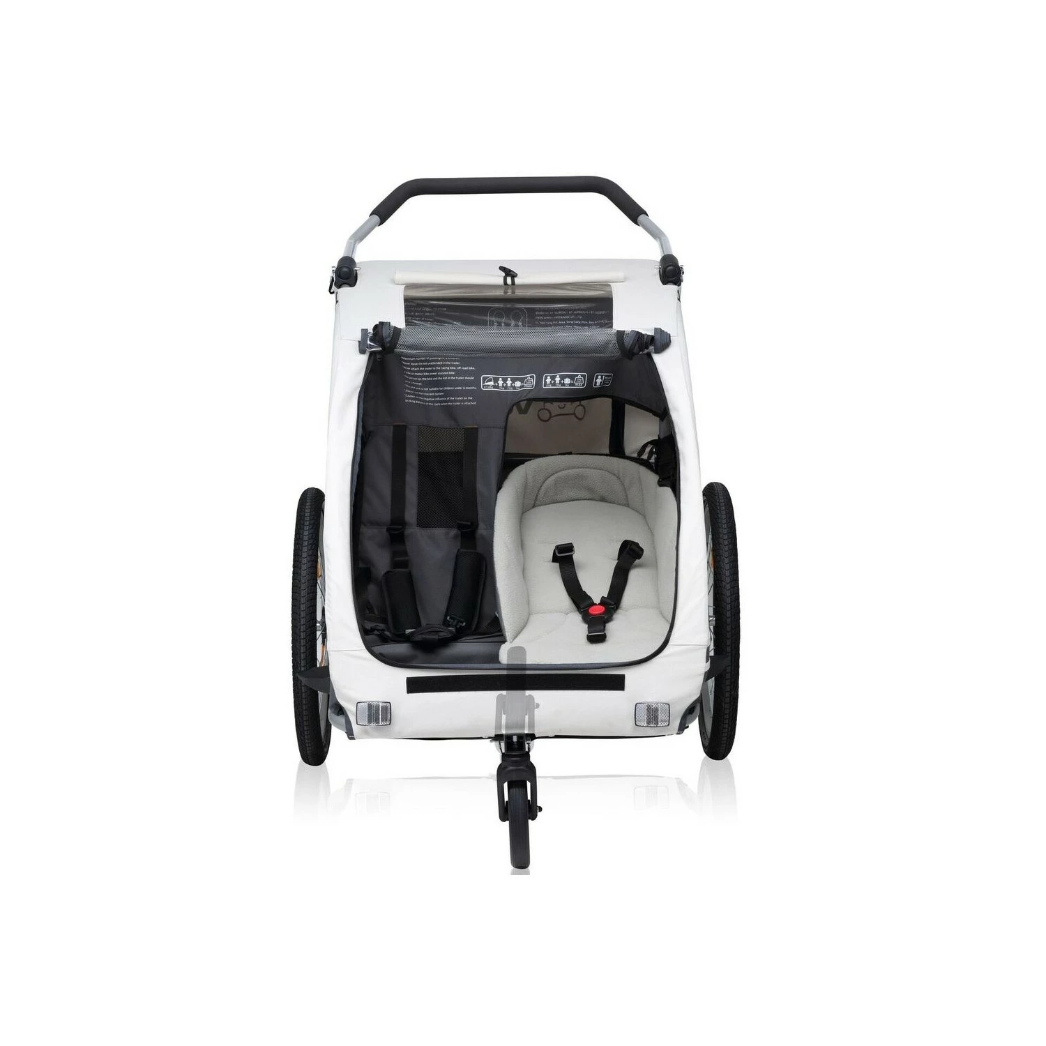Grâce à sa roue avant amovible, la remorque vélo enfant Buggy se transforme rapidement en poussette. En version classique, elle se fixe simplement sur la roue arrière du vélo.