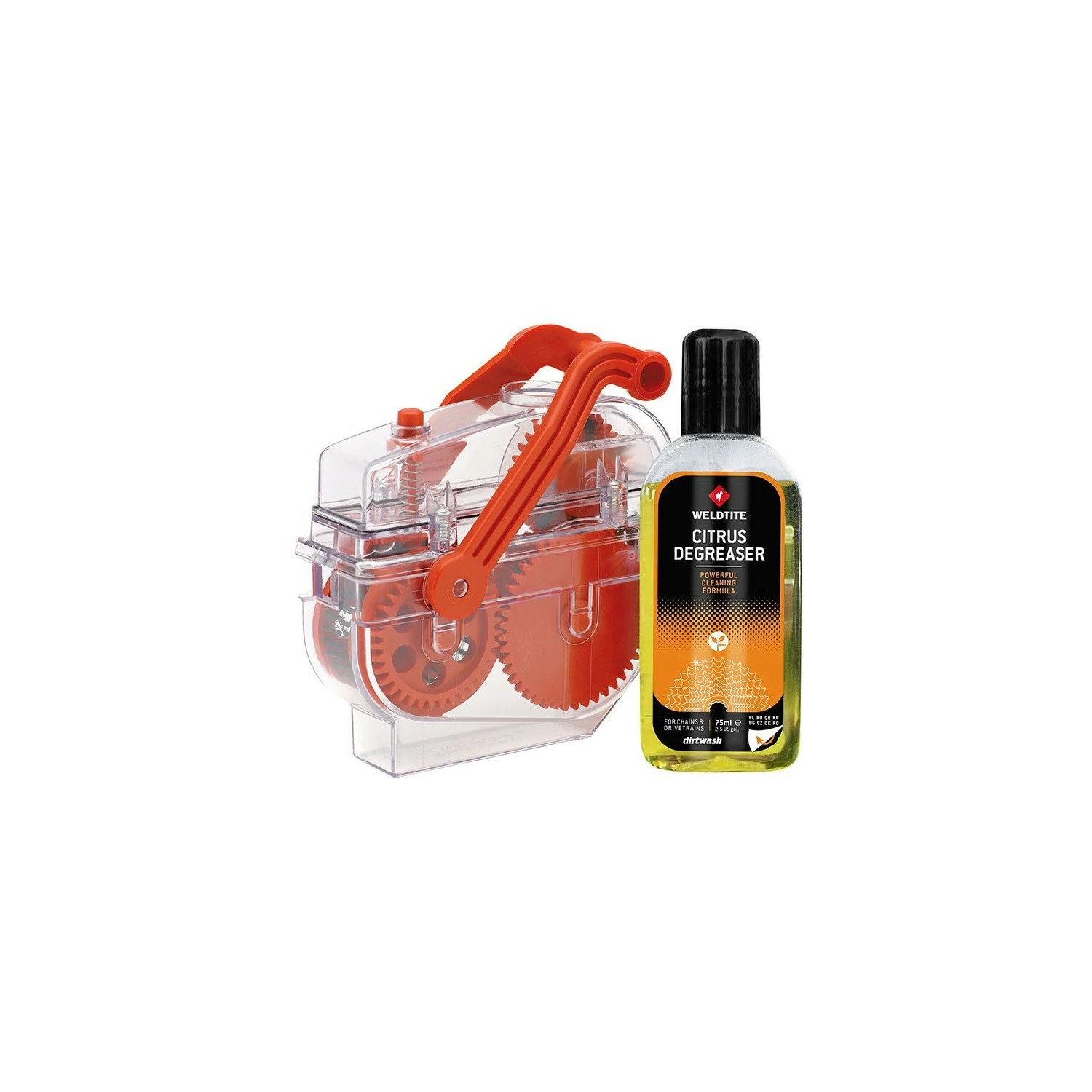 Outil dégraissant la chaîne avec l’action d’une brosse à quatre côtés, livré avec une bouteille de dégraissant agrumes de 75ml.